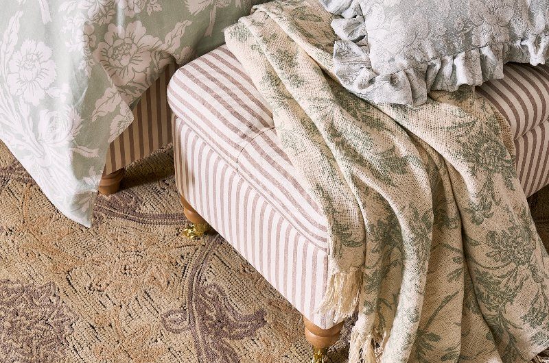 Tatton 200 Threadcount bedding set in Duck Egg, from £45, and Ropsley ottoman, £299, Laura Ashley.