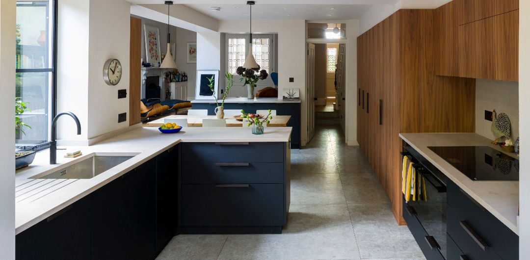 Inspired by their joint passion for mid-century modern design, David and Antonio opted for American Walnut as a key feature in the kitchen, teaming it with concrete-effect quartz worktops and large-format floor tiles, which they spotted in the showroom.